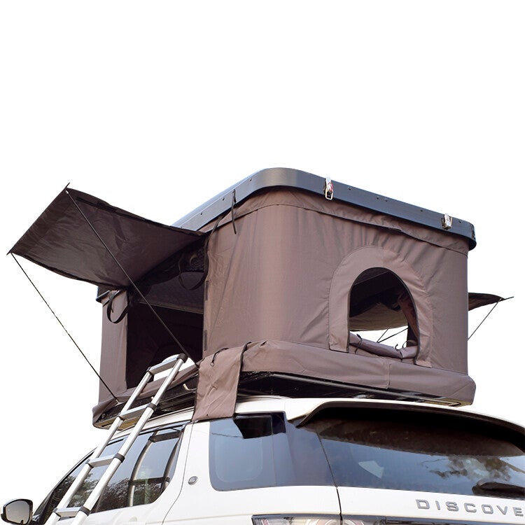 - Il coprimaterasso è dotato di cerniera e può quindi essere facilmente rimosso per il lavaggio. La scala in alluminio inclusa può essere allungata continuamente fino a una lunghezza di 102-205 cm. Dopo aver aperto le serrature sui lati anteriori, basta una leggera spinta per aprire automaticamente la tenda.